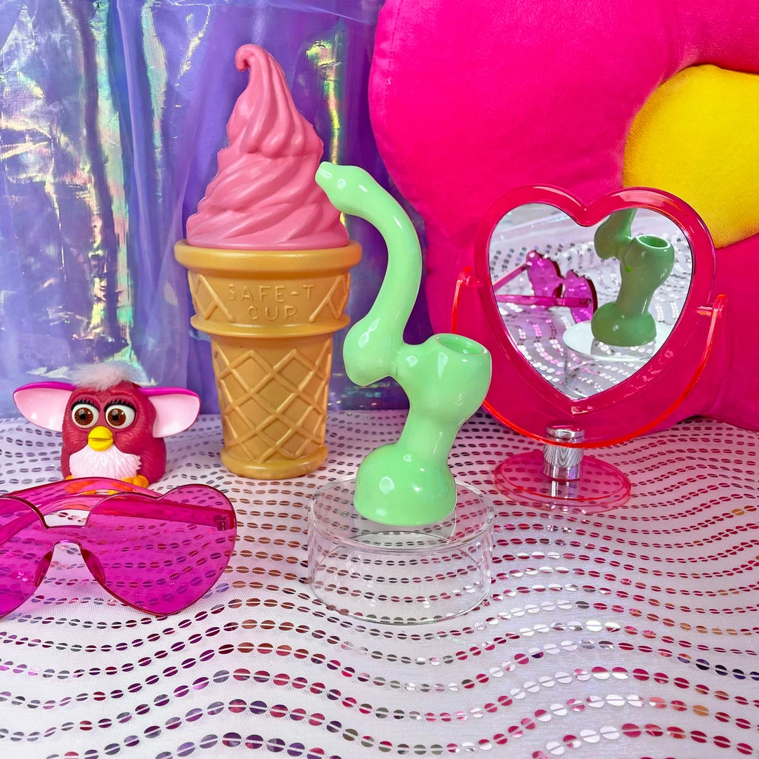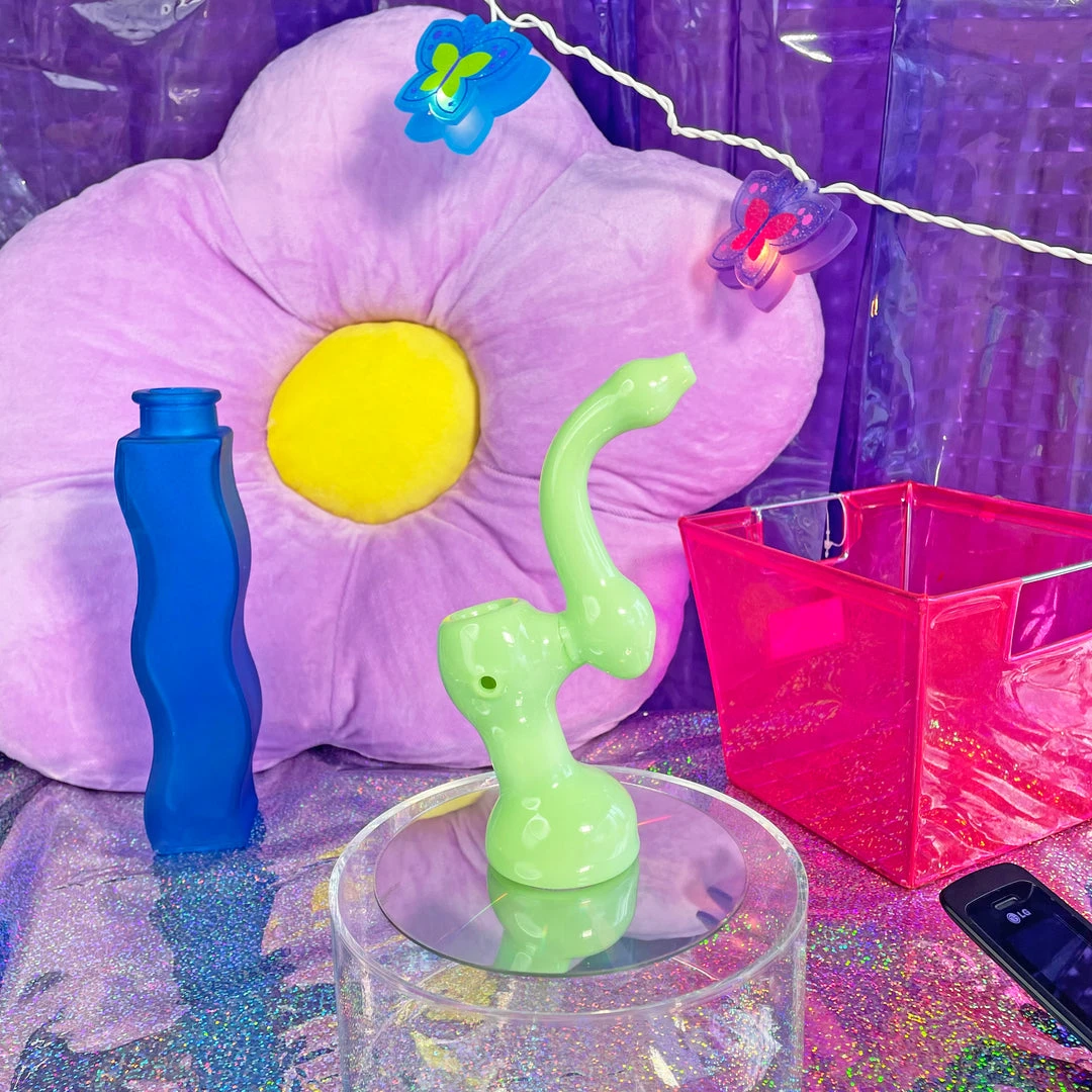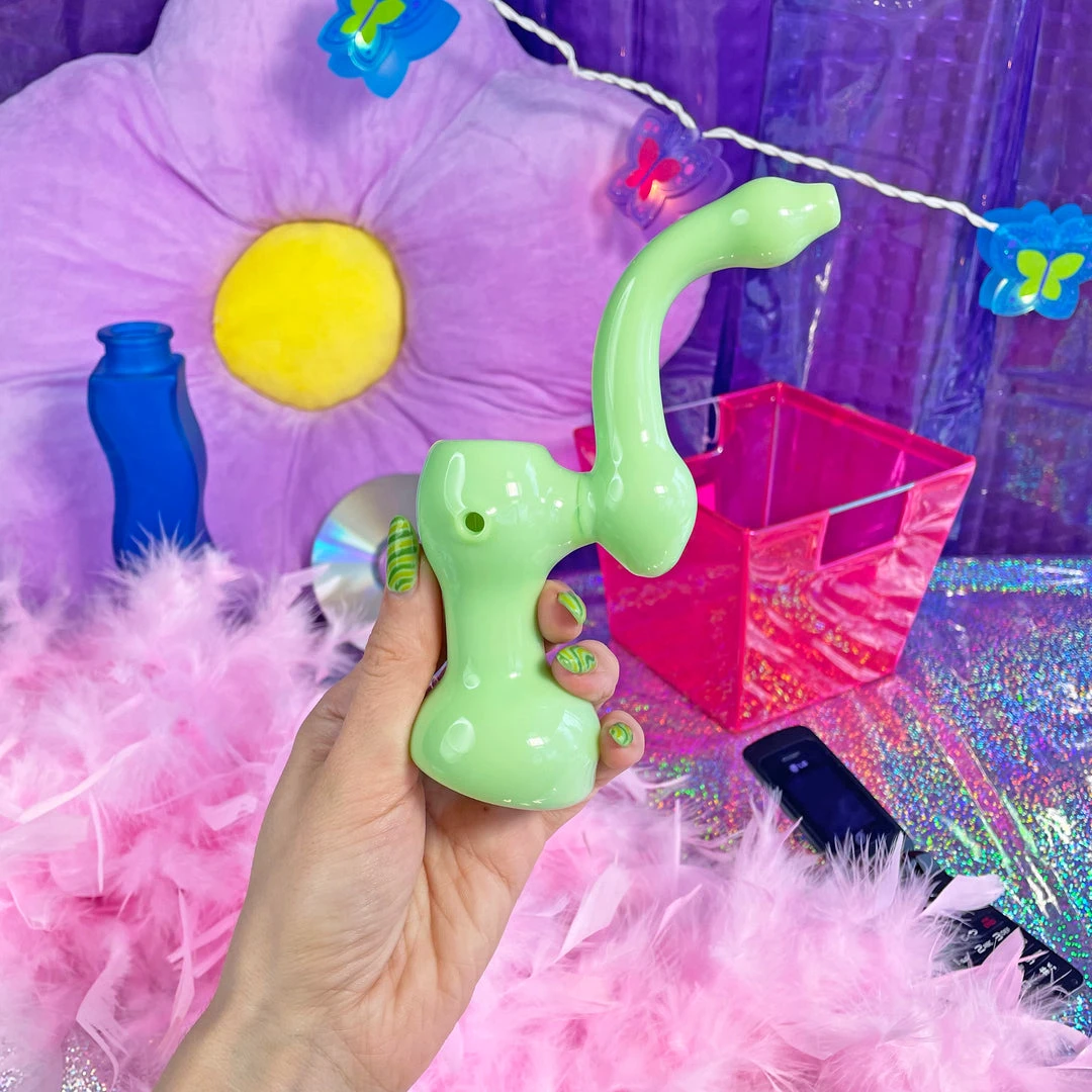 Love this piece! The bubblicious Bubbler measures 6.5″ tall. It stands steady and upright and is entirely mint green. The carb is on the left.