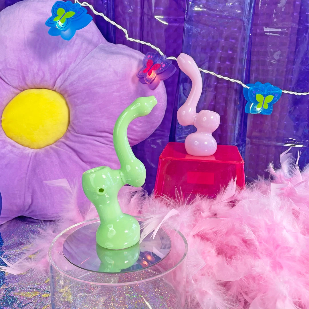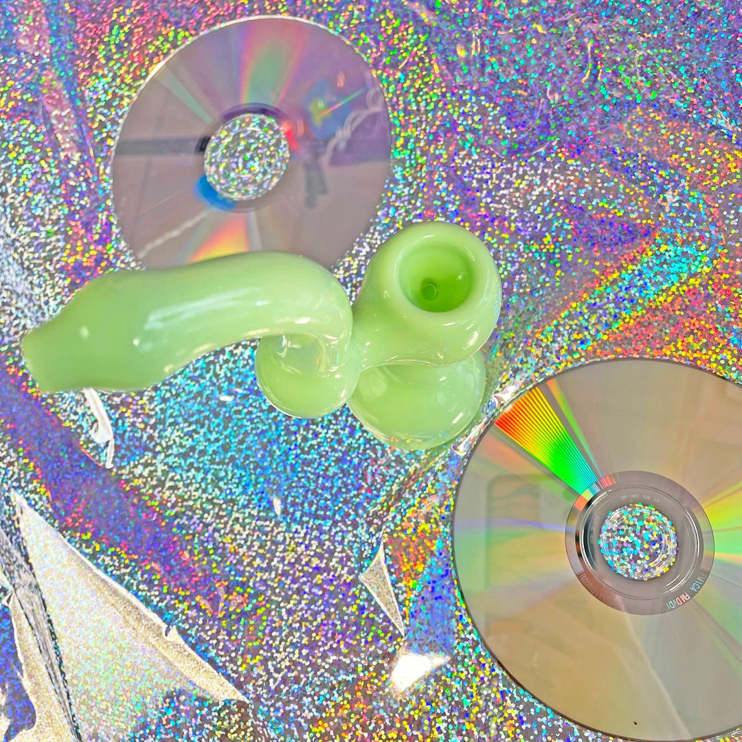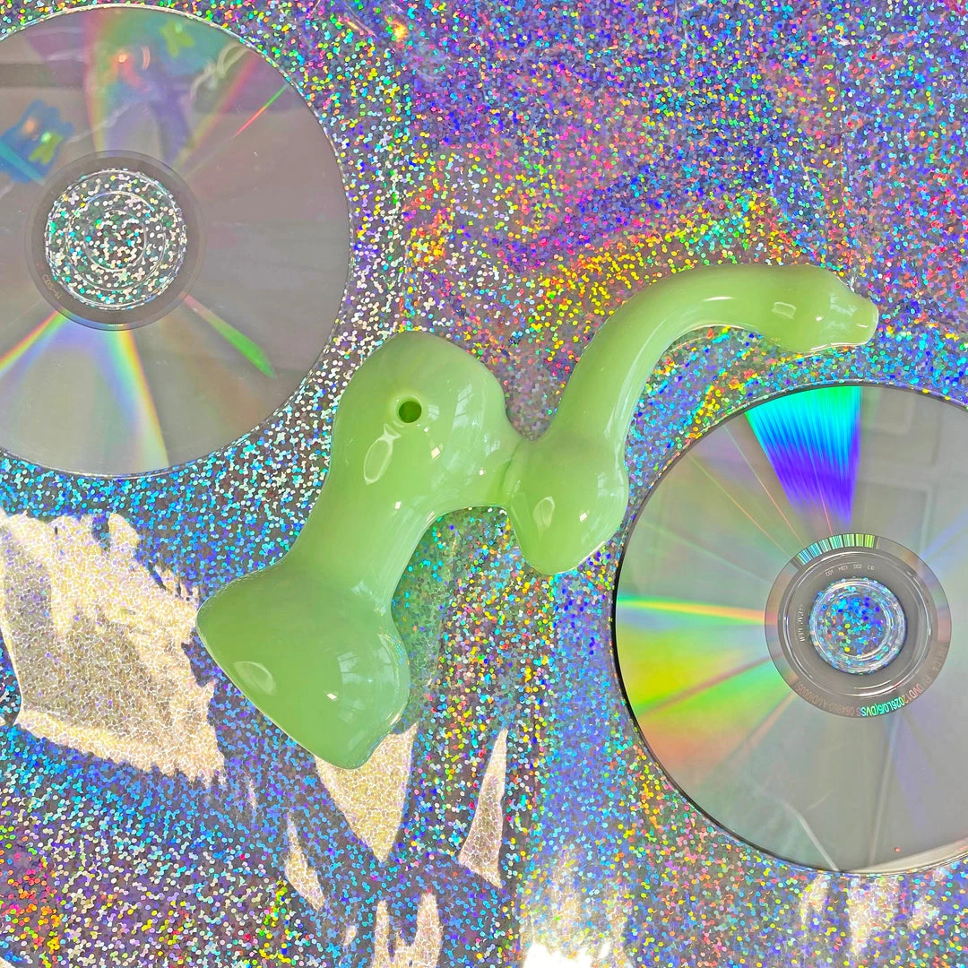 Love this piece! The bubblicious Bubbler measures 6.5″ tall. It stands steady and upright and is entirely mint green. The carb is on the left.