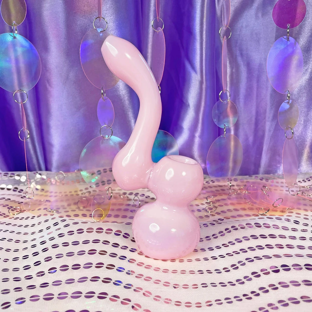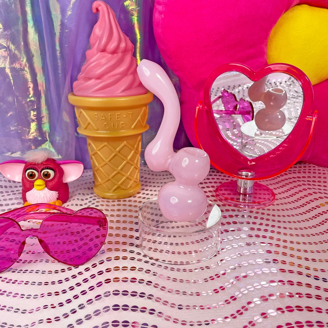 Love this piece! The bubblicious Bubbler measures 6.5″ tall. It stands steady and upright and is entirely bubble gum pink. The carb is on the left.