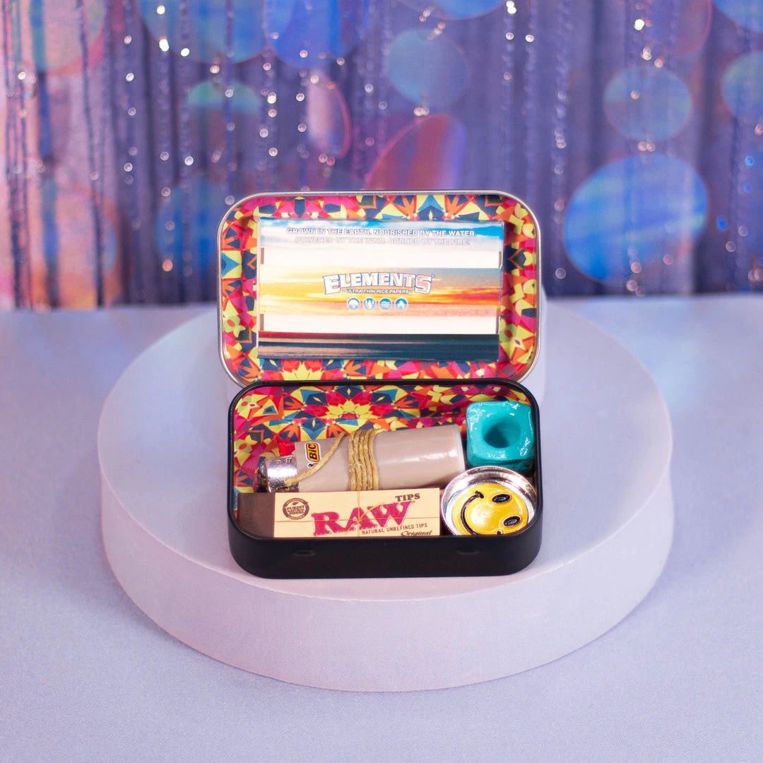 “Inside each Joint Kit is a mini grinder, mini handmade clay ashtray, RAW perforated tips, Element Rolling Papers (with a magnetic backing), and a mini Bic lighter with wax string. It truly has everything you need to roll the perfect joint wherever you go.