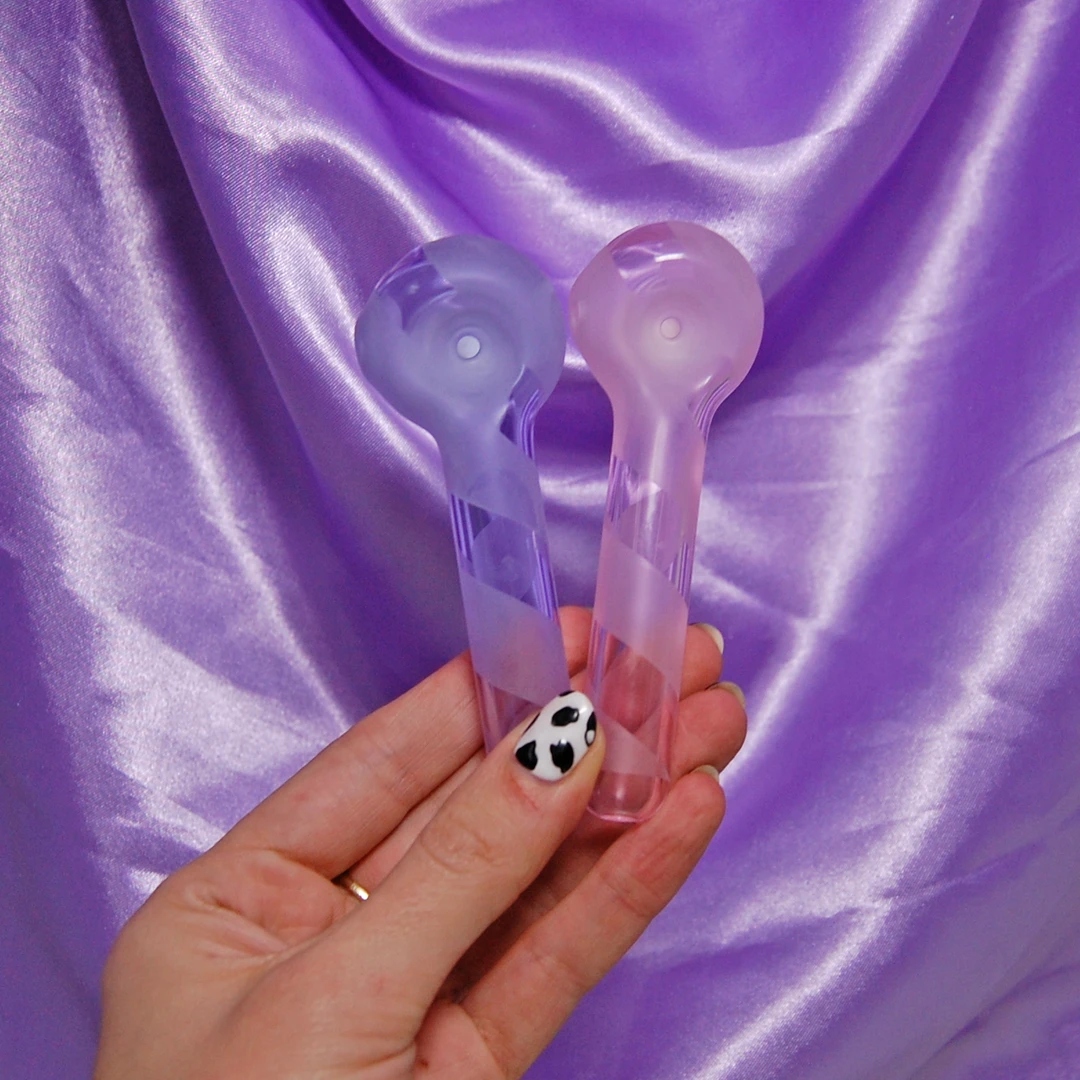 They are medium sized pipes featuring a swirling stripe wrapped around this pink frosted glass pipe. So sophisticated! Each pipe also has a flat bottom under the bowl to keep it from rolling 🙂