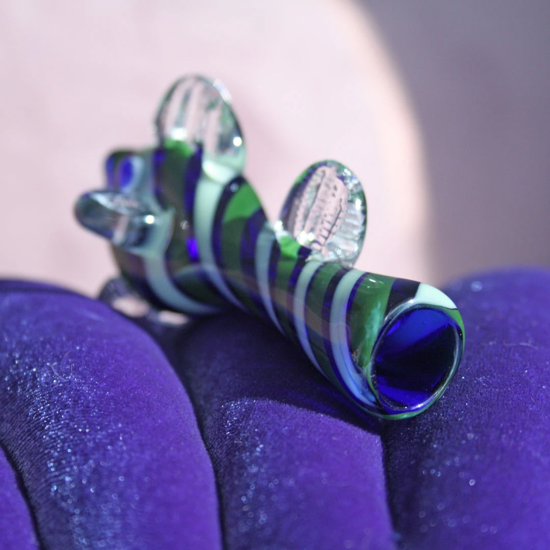 This chillum is shaped like a cute lil fish! He rests on the table in his perfect horizontal fish posture. Pack herbs into the back of his tail and the mouthpiece is his mouth.