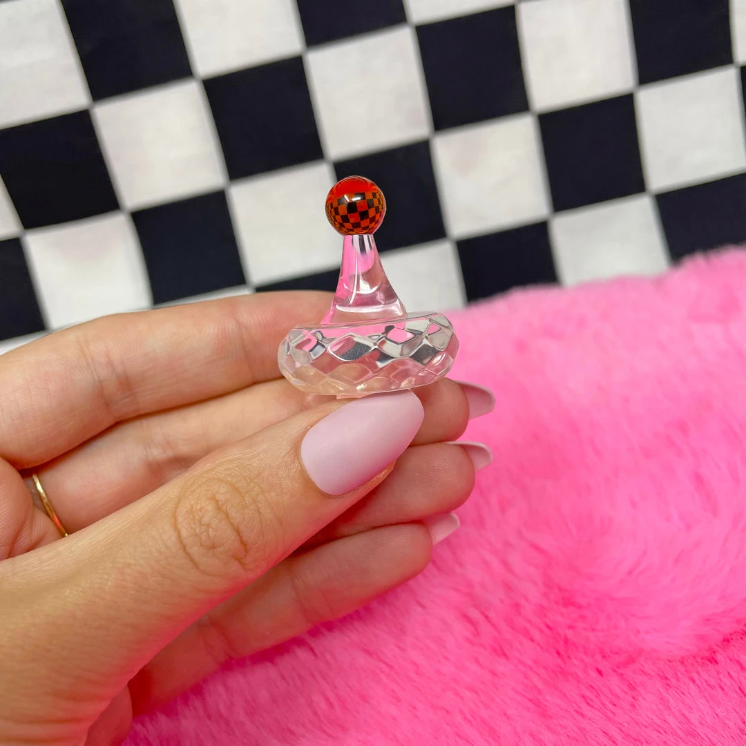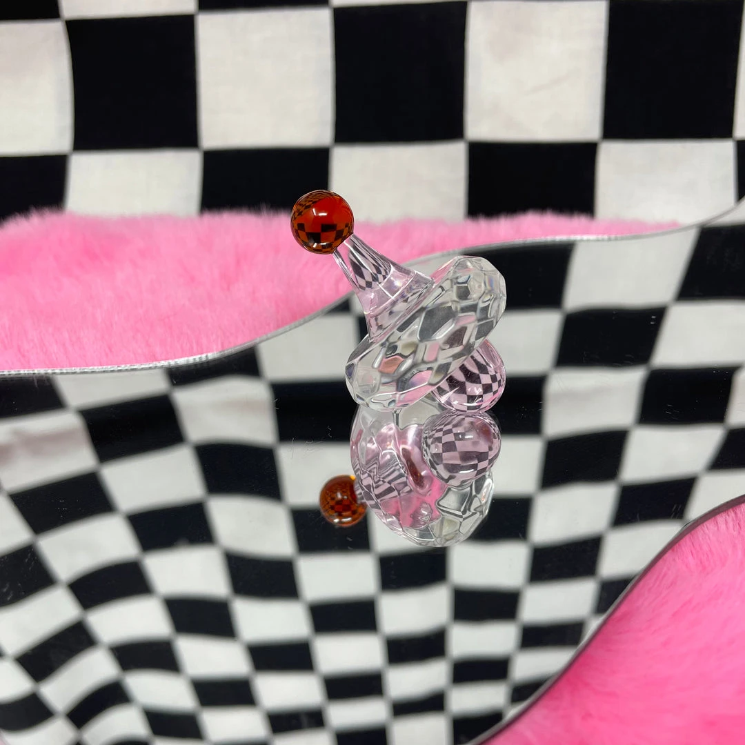 This cutie carb cap is made of faceted clear glass with a hershey kiss shaped pink cone with a red dot on top. We don’t know what it is but we like it. Clown hat? Sorry piece? It cute!