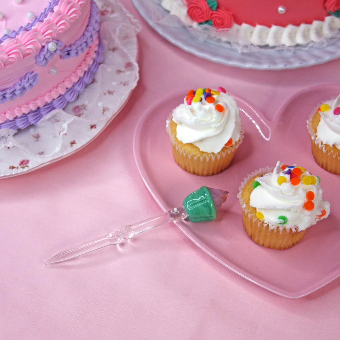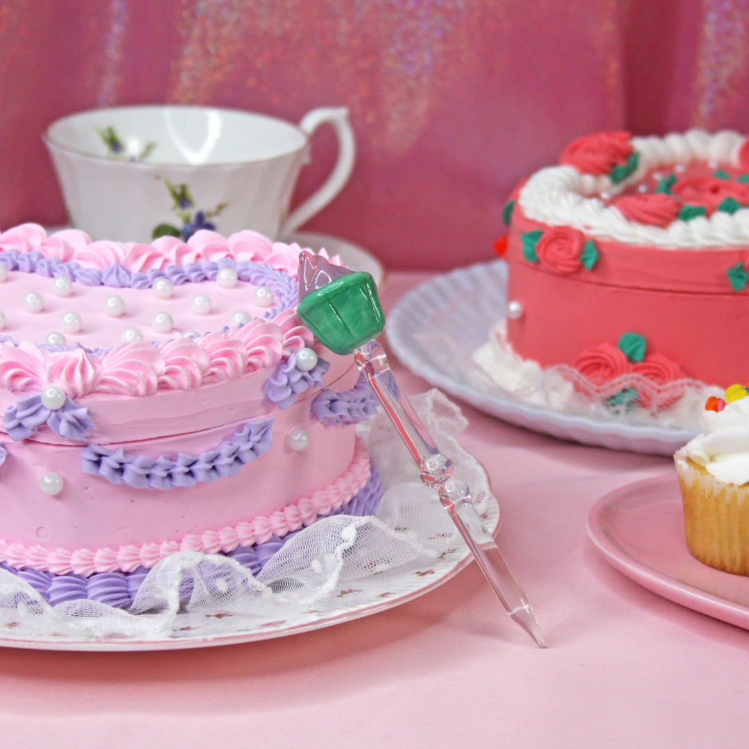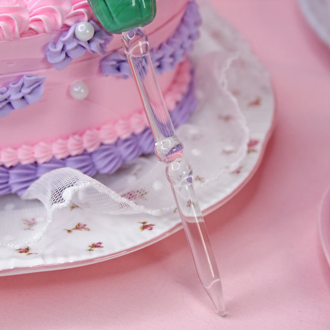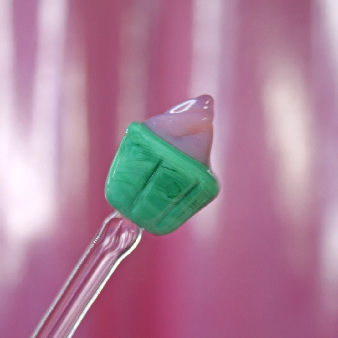 Dab tool measures 5″ and is made of clear borosilicate glass. The sweetest pie I mean cupcake sits on top and is made of jade and pink glass.