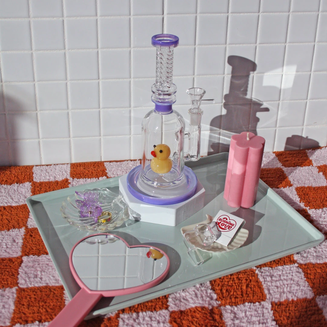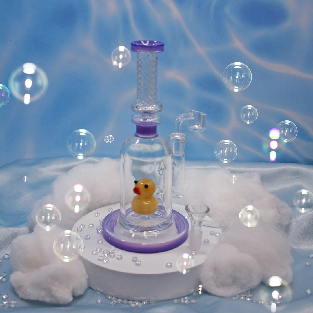 This bb measures 8.75″ tall and has clear glass with purple accents on the base, neck, and mouthpiece. This piece is very stable because of the circular base. a twisted glass neck and duckie-shaped perc make for one gorgeous piece!