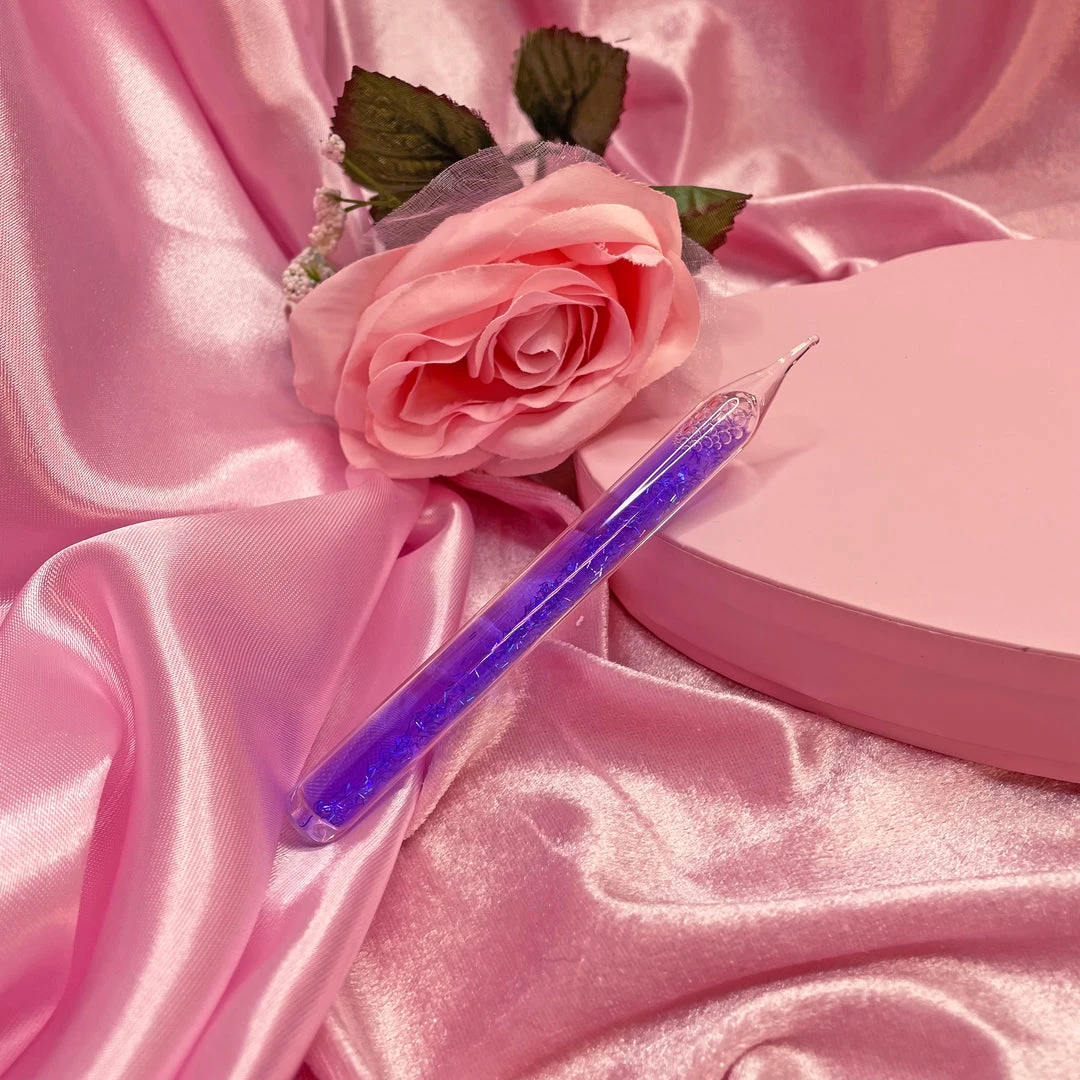 This dab tool is made of glass and filled with glitter in a colored liquid.