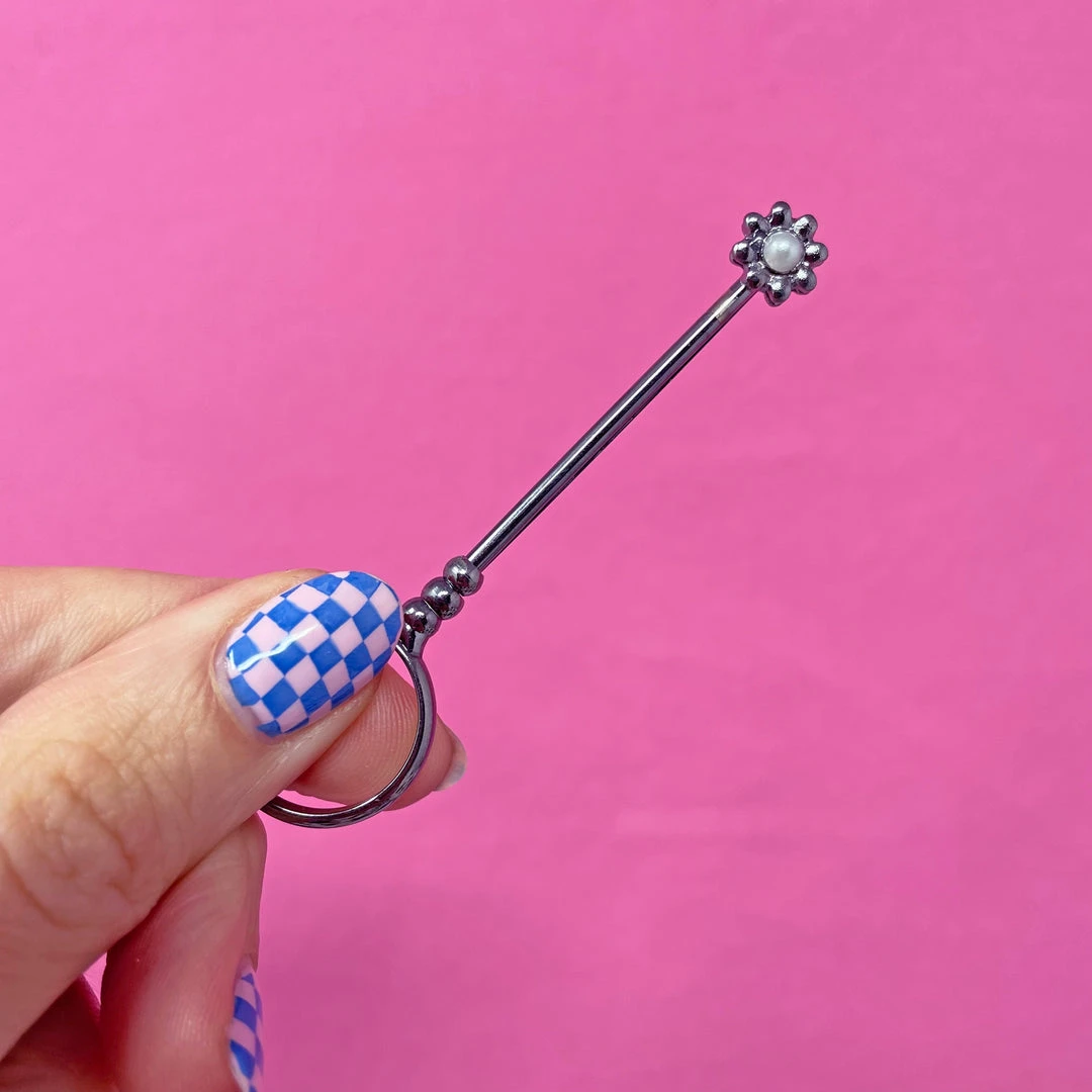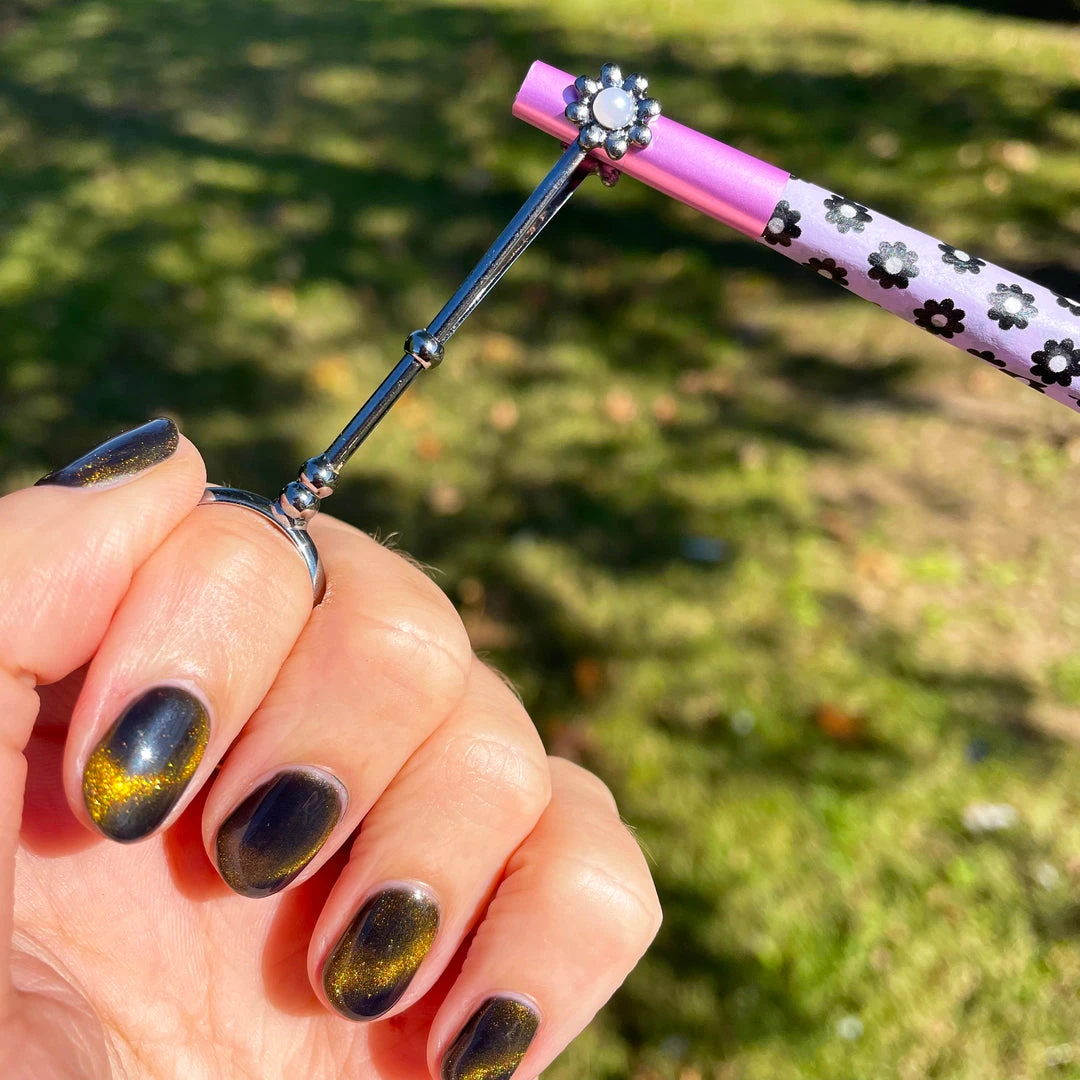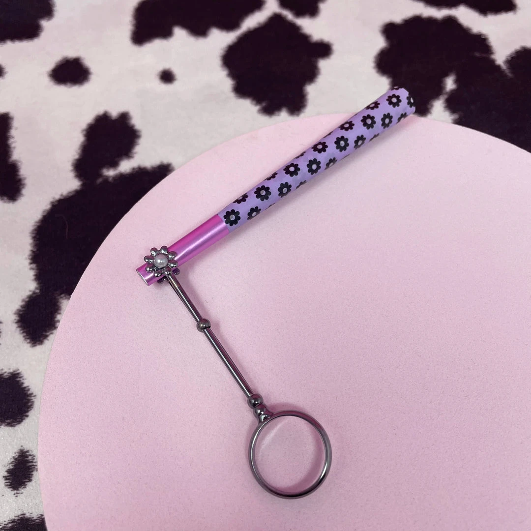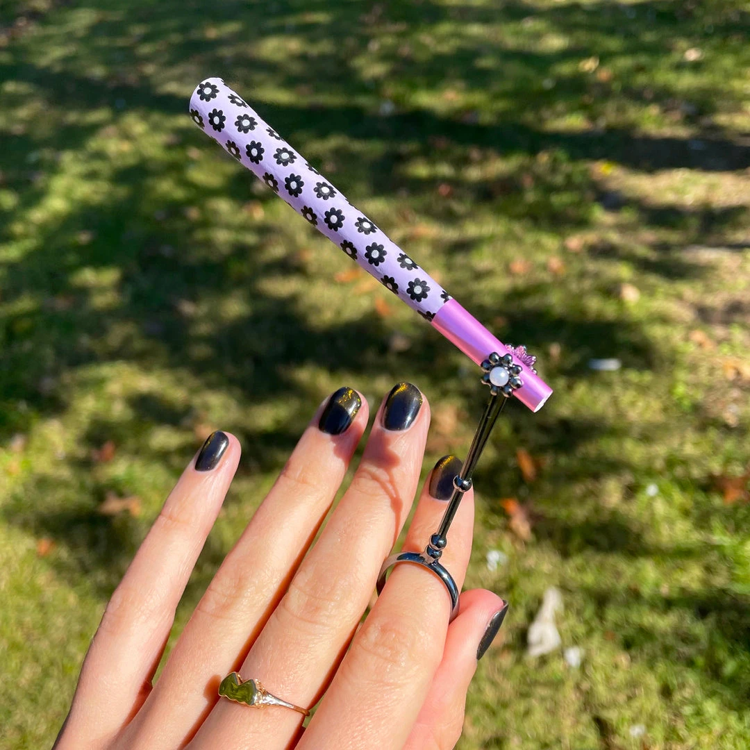 This ring is adjustable to fit any size joint, roach, or cig by moving the bead up or down the stem of the holder. Joint slides between the decorative metallic flowers on the top of the ring. The cute flower on top holds your j and has a cute lil pearl in the center 🙂