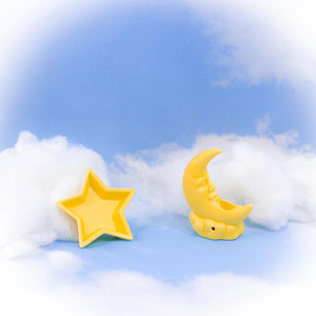 Made of buttery yellow ceramic, this piece features a carb on the side of the cloud and a mouthpiece on the opposite end of the moon. The bowl is below the mouth of the moon.
