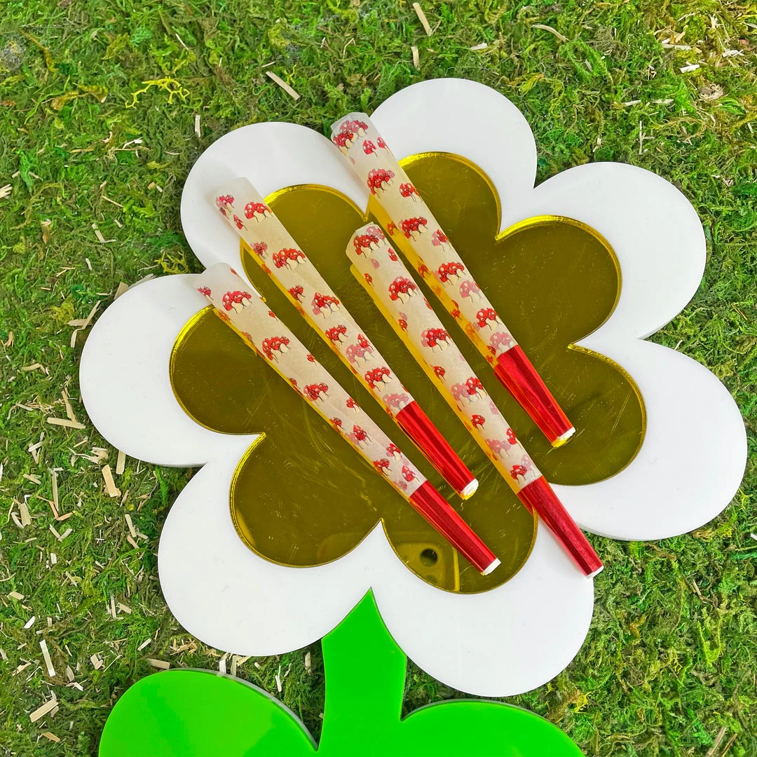 The paper in the cones are made from a slow burning natural palm pulp or hemp rolling paper. The printing pigment is derived from edible hempseed, soy oils and natural pigments. They are processed without chemicals and are naturally white. The tip is made with foodsafe non-plastic material. The food grade foil tip remains cool while smoking. These cones have passed California category III testing and are free from contamination. Cones are free from pesticides, resins, heavy metals and biological contaminants. Enjoy!