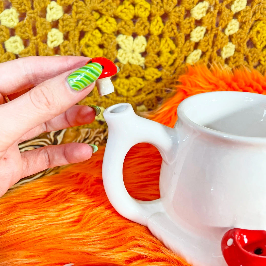 The lid of the mug is also shaped like a mushroom! Could be fun to put some herb in there if you’re smoking on the go.Â