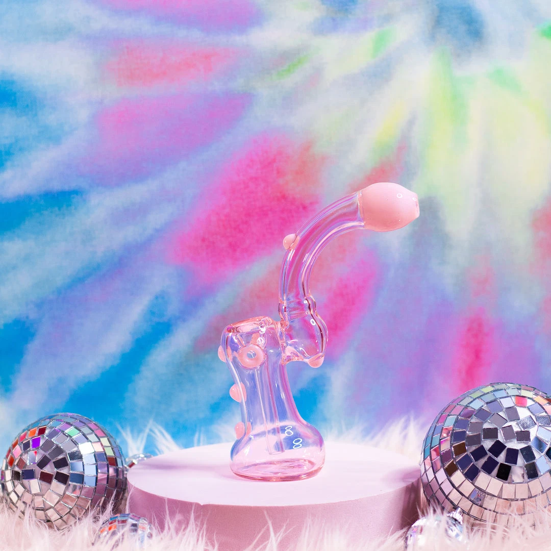 The Powerpuff bubbler measures approx 7.5″ tall. It has a pretty large smoke chamber. It stands steady and upright and has cool opaque frit details. The carb is on the left.