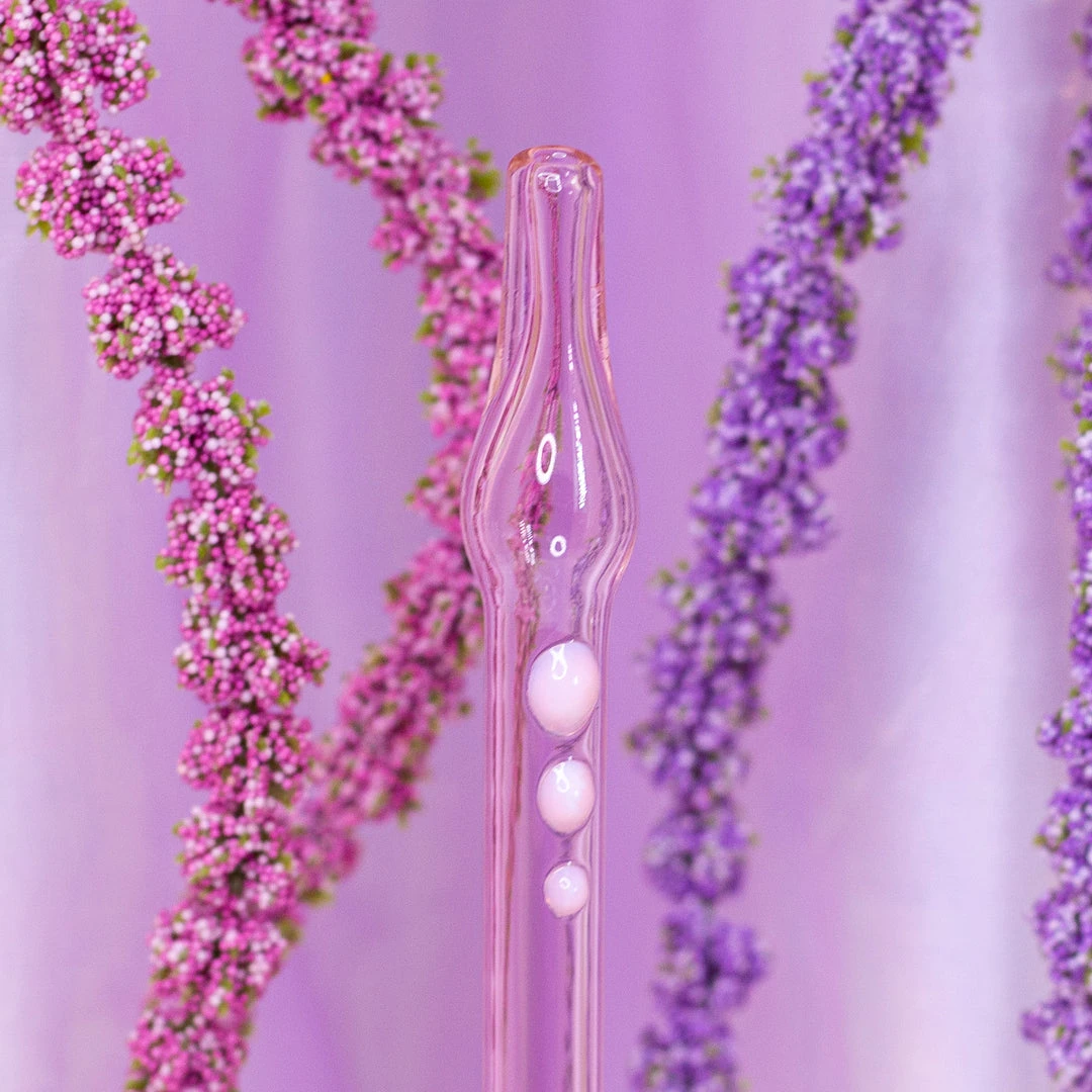 These pink glass dab straws are pink borosilicate glass and include light pink dotted grips.