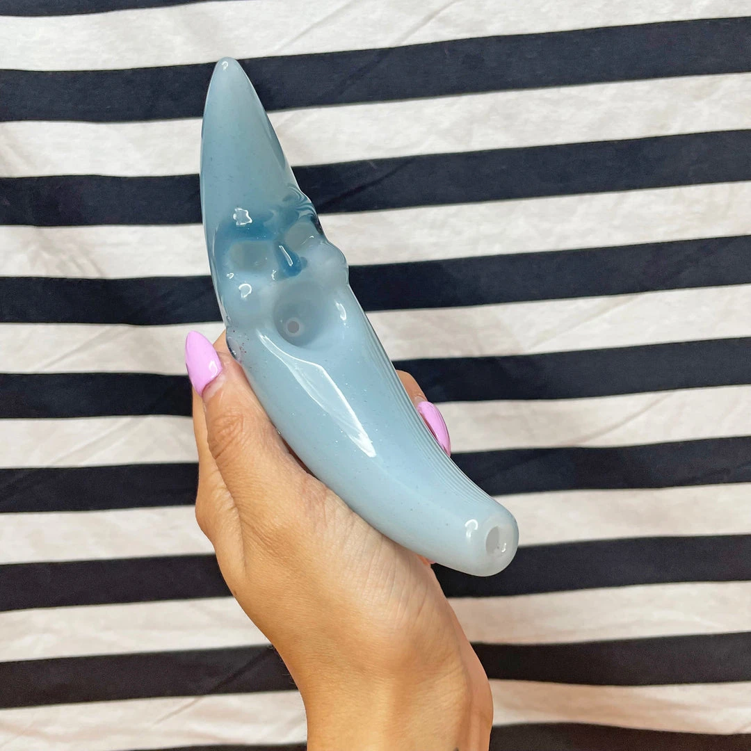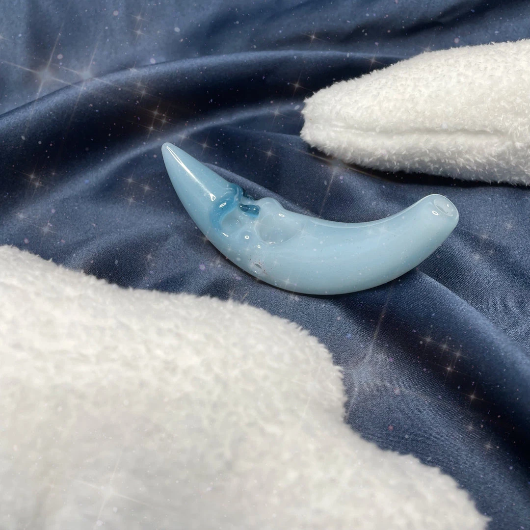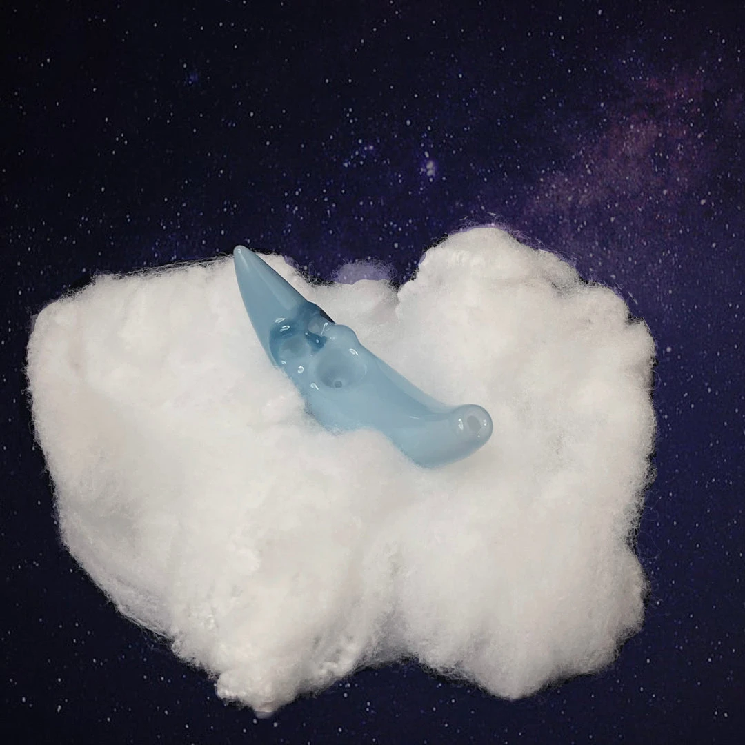 Made of milky light blue glass, this piece features a carb on the tip of the moon and a mouthpiece on the opposite end. The bowl is the mouth of the moon.