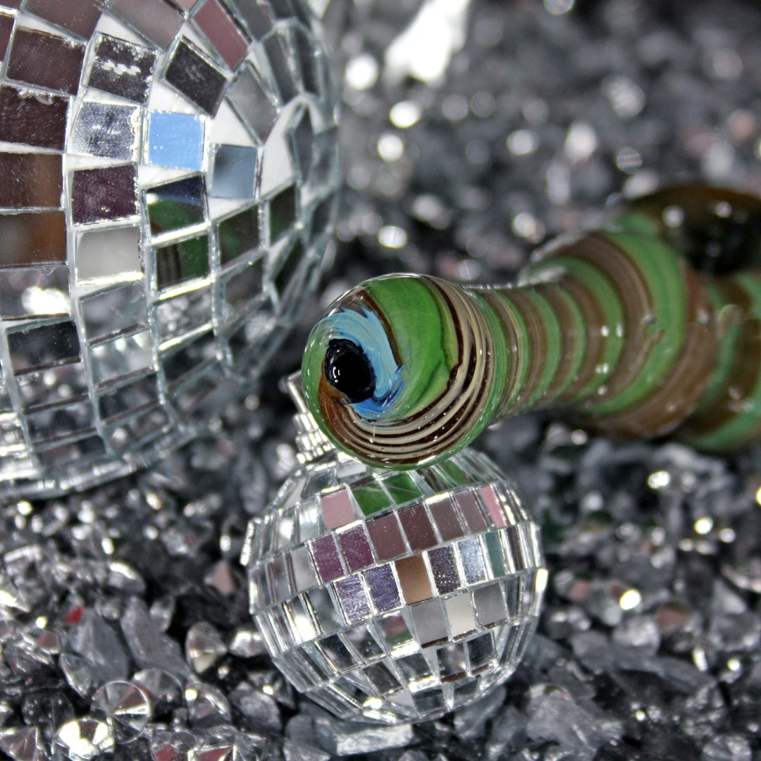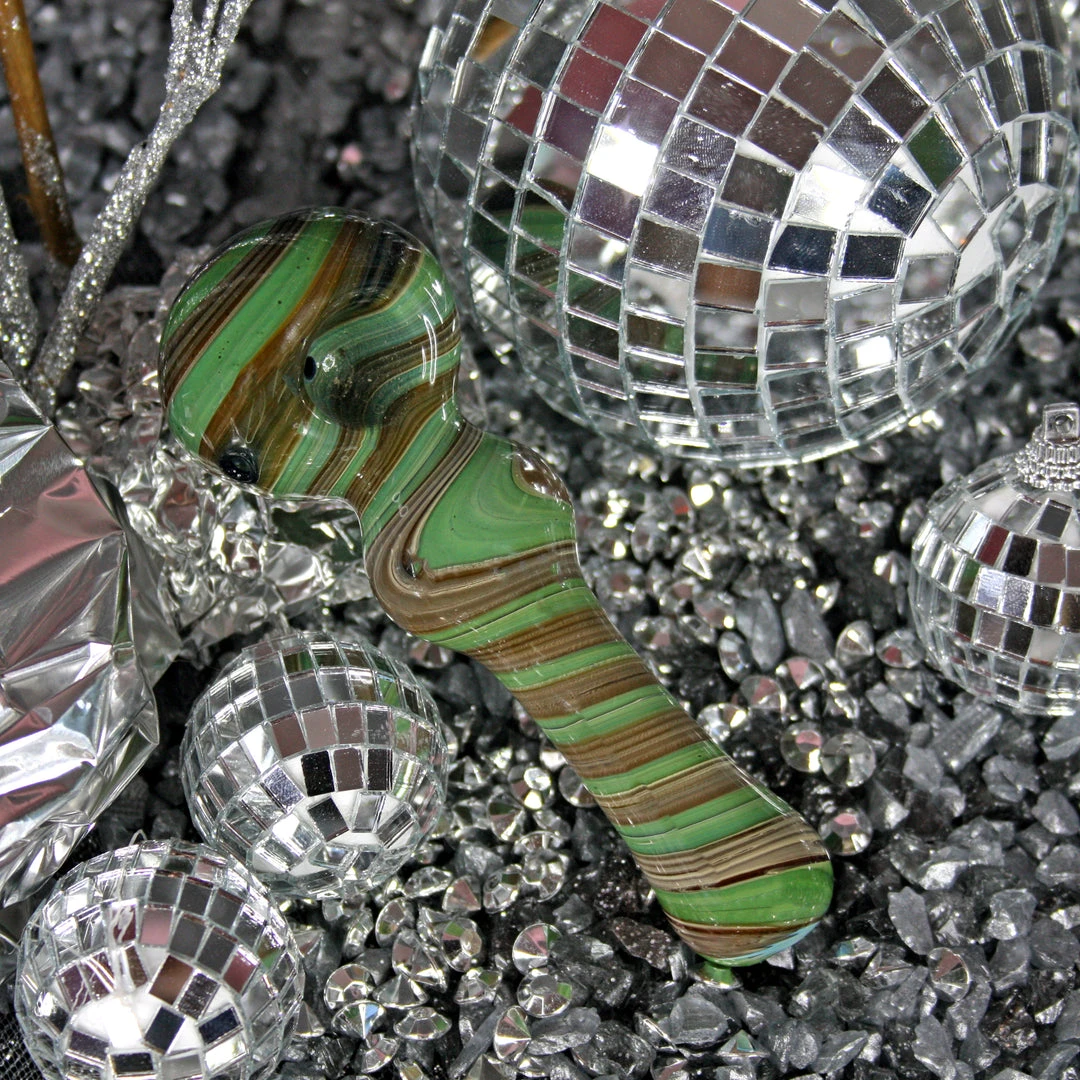 This pipe is 4.5″ long and is covered in mesmerizing swirls of colored glass.