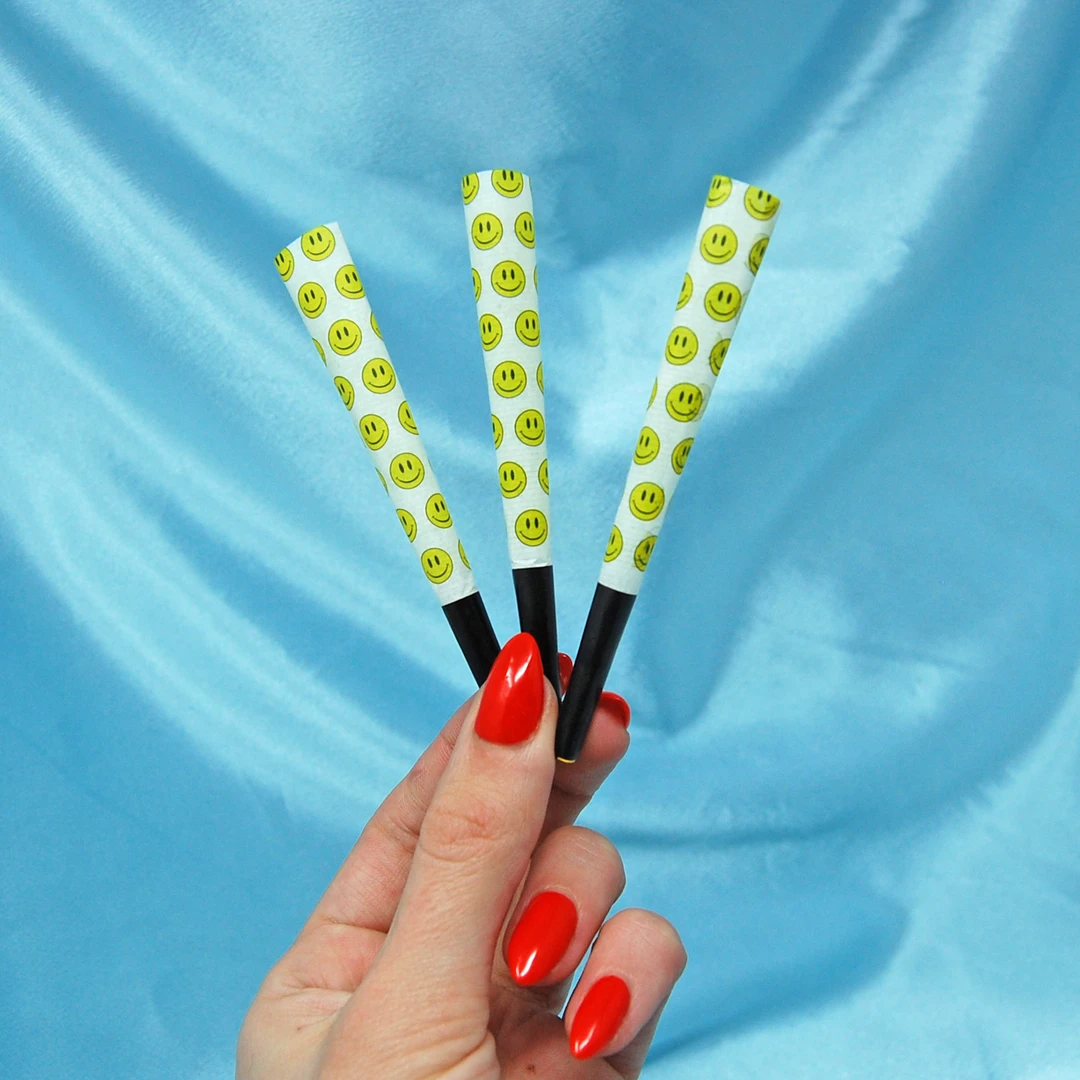 Each pack contains 6 cones in a crush-safe box. The box also includes a packing tool. Cones come pre-rolled. This set only includes the smiley face cones with black tips, not the others in the photos 🙂