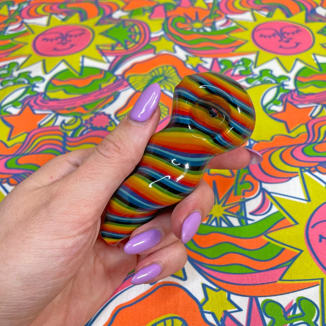 These pipes has a super fun stripey rainbow twisted around the entire pipe. A fun twisted stem makes this pipe easy to hold!
